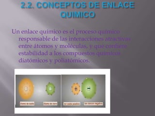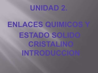 Este documento trata sobre los enlaces químicos y el estado sólido cristalino. Explica que un enlace químico es responsable de las interacciones atractivas entre átomos y moléculas que confieren estabilidad a los compuestos. Describe los diferentes tipos de enlaces como iónicos y covalentes, y cómo se forman compuestos cristalinos iónicos como el cloruro de sodio. También cubre conceptos como la regla del octeto y los símbolos de Lewis para representar moléculas.