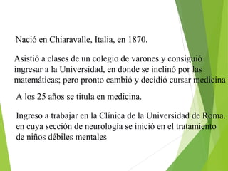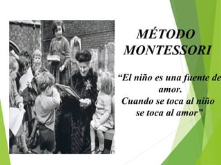 María Montessori desarrolló un método educativo basado en la observación de niños y en darles libertad para elegir y explorar materiales didácticos por sí mismos, lo que les permitía aprender de forma autodirigida y desarrollar disciplina interna. Su método se centraba en el desarrollo del niño a través de actividades prácticas y sensoriales en un ambiente preparado específicamente. Montessori aplicó con éx