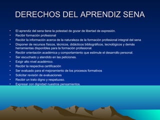 El documento detalla los deberes y derechos de los aprendices del SENA. Entre los deberes se encuentran cumplir con las políticas institucionales, respetar los derechos ajenos, participar en actividades complementarias, informar sobre novedades, proteger los recursos naturales y culturales, acatar las decisiones del manual de convivencia, respetar los derechos de autor, conocer y asumir las políticas, actuar con base en principios, hacer uso apropiado de los espacios e informar irregularidades. Los derechos incluyen la