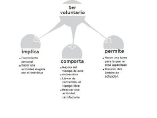 El documento describe el voluntariado, incluyendo sus diferentes tipos como el voluntariado de acción social, en cooperación al desarrollo y cibervoluntariado. Explica que el voluntariado implica realizar tareas no remuneradas de interés general para beneficiar a otros. También cubre los principios del voluntariado como la libre elección, la solidaridad y la acción organizada, así como los colectivos y ámbitos en los que se puede realizar tareas de voluntariado.