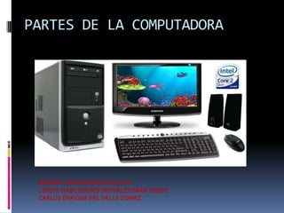 Este documento describe las principales partes de una computadora, incluyendo el gabinete, periféricos de entrada y salida, procesador, monitor, teclado, memoria a corto y largo plazo, ventilador, hardware y software. Explica que el procesador funciona como el cerebro de la computadora, la RAM como memoria temporal y el disco duro almacena información de manera permanente.