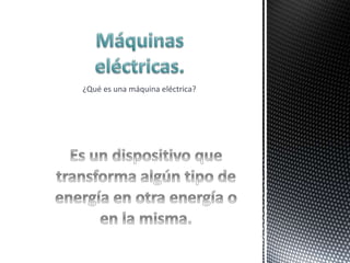 Este documento describe diferentes tipos de máquinas eléctricas. Se clasifican en rotatorias como generadores y motores de corriente directa y alterna, y estáticas como transformadores, auto-transformadores y máquinas de medida y protección. Los generadores convierten energía mecánica en eléctrica mediante la inducción electromagnética, mientras que los motores hacen lo opuesto convirtiendo energía eléctrica en mecánica. Los transformadores permiten aumentar o disminuir la tensión eléctrica manteniendo la potencia.