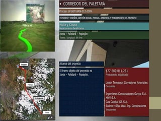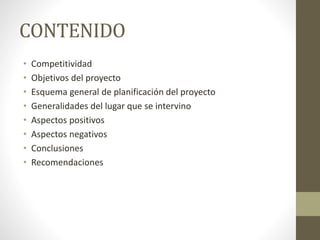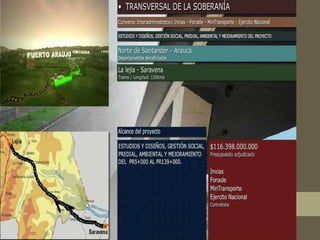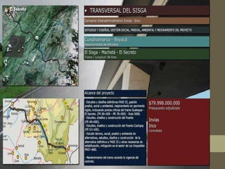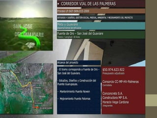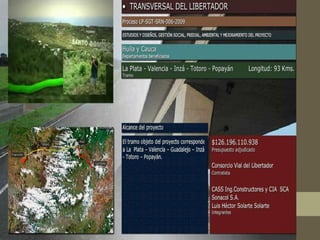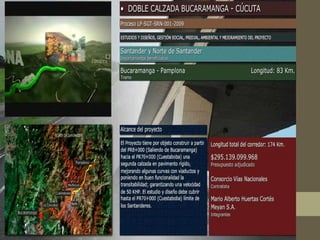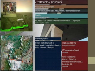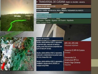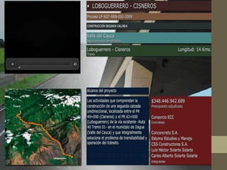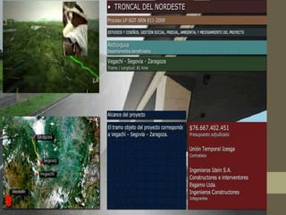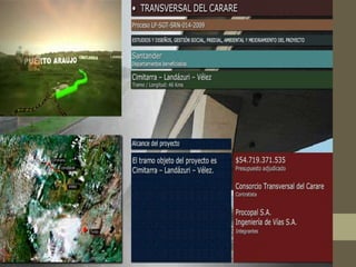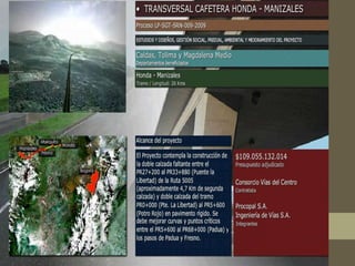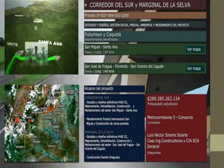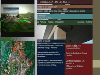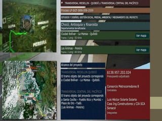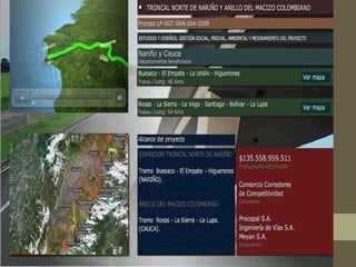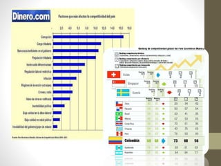 El documento propone mejorar la infraestructura de transporte y logística de Colombia para aumentar su competitividad a nivel mundial. El plan incluye la construcción de varias carreteras por un total de $2.4 billones y 1605 km, y promover modos de transporte alternativos como el ferrocarril y fluvial. Las conclusiones son que la infraestructura es clave para el desarrollo económico del país y que se deben distribuir equitativamente los beneficios de manera de apoyar también a las pequeñas empresas.