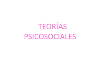 Este documento presenta un resumen de varias teorías psicosociales, incluyendo las teorías del desarrollo del yo de Erikson y los patrones de apego. Describe las diferentes etapas psicosociales desde la infancia hasta la vejez, resaltando los conflictos clave en cada etapa entre desarrollos psicológicos opuestos como la confianza vs. desconfianza, autonomía vs. vergüenza, identidad vs. confusión de roles, y generatividad vs. estancamiento.