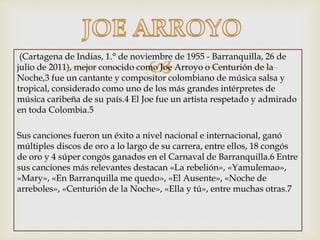 Joe Arroyo fue un cantante y compositor colombiano de música salsa y tropical, considerado uno de los más grandes intérpretes de música caribeña de su país. Entre sus canciones más exitosas se encuentran "La rebelión", "Yamulemao" y "En Barranquilla me quedo". Tuvo gran éxito nacional e internacional y recibió numerosos premios, incluyendo 18 congós de oro.