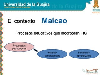 Este documento resume el impacto del uso de las TIC en la educación en el Municipio de Maicao. Se ha producido una transición hacia metodologías innovadoras mediadas por TIC, aunque todavía se carece de políticas institucionales claras. El estudio encontró procesos educativos significativos apoyados por entidades gubernamentales y universidades. Sin embargo, se necesita más formación docente y redes de apoyo para mejorar el uso pedagógico de las TIC.
