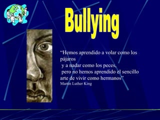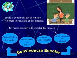 Este documento trata sobre la violencia escolar y el bullying. Explica que existen diferentes tipos de violencia entre profesores-alumnos, alumnos-alumnos e incluso entre profesores. Luego describe las características de agresores, víctimas y espectadores, así como las consecuencias negativas del bullying. Finalmente, propone estrategias para prevenir la violencia, promover la comprensión mutua y enfrentar la crueldad y el abuso.
