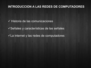 Este documento presenta una introducción a las redes de computadoras. Explica brevemente la historia de las comunicaciones desde el telégrafo y teléfono hasta el desarrollo de Internet y las redes de computadoras. Define conceptos clave como datos, señales, modulación, codificación y diferentes tipos de redes. Además, describe los principales componentes y capas de una red, así como algunas técnicas de transmisión de datos.