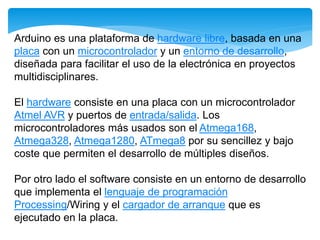 Arduino es una plataforma de hardware libre basada en una placa con microcontrolador y entorno de programación diseñado para facilitar el uso de electrónica en proyectos. Consiste en placas con microcontroladores Atmel de bajo costo y puertos de entrada/salida, y un entorno de desarrollo que implementa el lenguaje de programación Processing/Wiring. Se inició en 2005 para proyectos estudiantiles y su nombre viene del bar donde pasaba tiempo uno de sus fundadores.