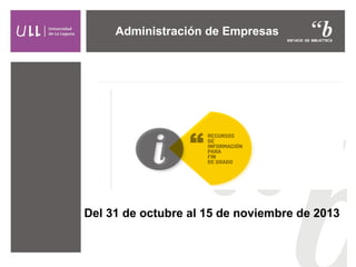 La biblioteca universitaria ofrece un curso para estudiantes de Administración de Empresas sobre el uso de recursos bibliotecarios. El curso se llevará a cabo del 31 de octubre al 15 de noviembre de 2013 y tiene como objetivos enseñar a los estudiantes a acceder y utilizar los recursos electrónicos de la biblioteca, gestionar referencias bibliográficas y citar información de forma correcta. El curso se realizará a través de la plataforma virtual de la universidad y los estudiantes podrán obtener un certificado