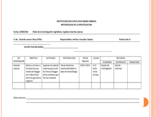 Este documento presenta un proyecto de grado sobre agricultura orgánica y huertas caseras realizado por Jennifer León y Melisa Gonzales para la especialista Rosa Orfilia Rendón. El proyecto incluye un marco referencial, histórico, bases teóricas, objetivos, método de investigación y conclusiones sobre las ventajas de las huertas orgánicas y la importancia de cambiar los hábitos alimenticios a través de esta técnica.
