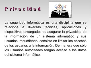 La seguridad informática se encarga de proteger la privacidad y la integridad de la información almacenada mediante técnicas como la criptografía, las contraseñas y los firewalls. Los spywares y otros ataques amenazan la privacidad al robar datos sin consentimiento. Las herramientas de seguridad incluyen copias de seguridad para restaurar datos, antivirus para detectar virus y parches para corregir errores y agregar funcionalidad de seguridad.