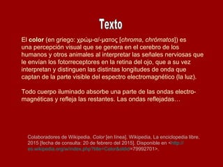 El documento explica brevemente cómo se percibe el color. Define el color como una percepción visual generada en el cerebro al interpretar las señales nerviosas enviadas por los fotorreceptores de la retina del ojo. Estos fotorreceptores captan diferentes longitudes de onda de la luz visible y las distinguen. También menciona que los cuerpos iluminados absorben algunas ondas electromagnéticas y reflejan el resto.