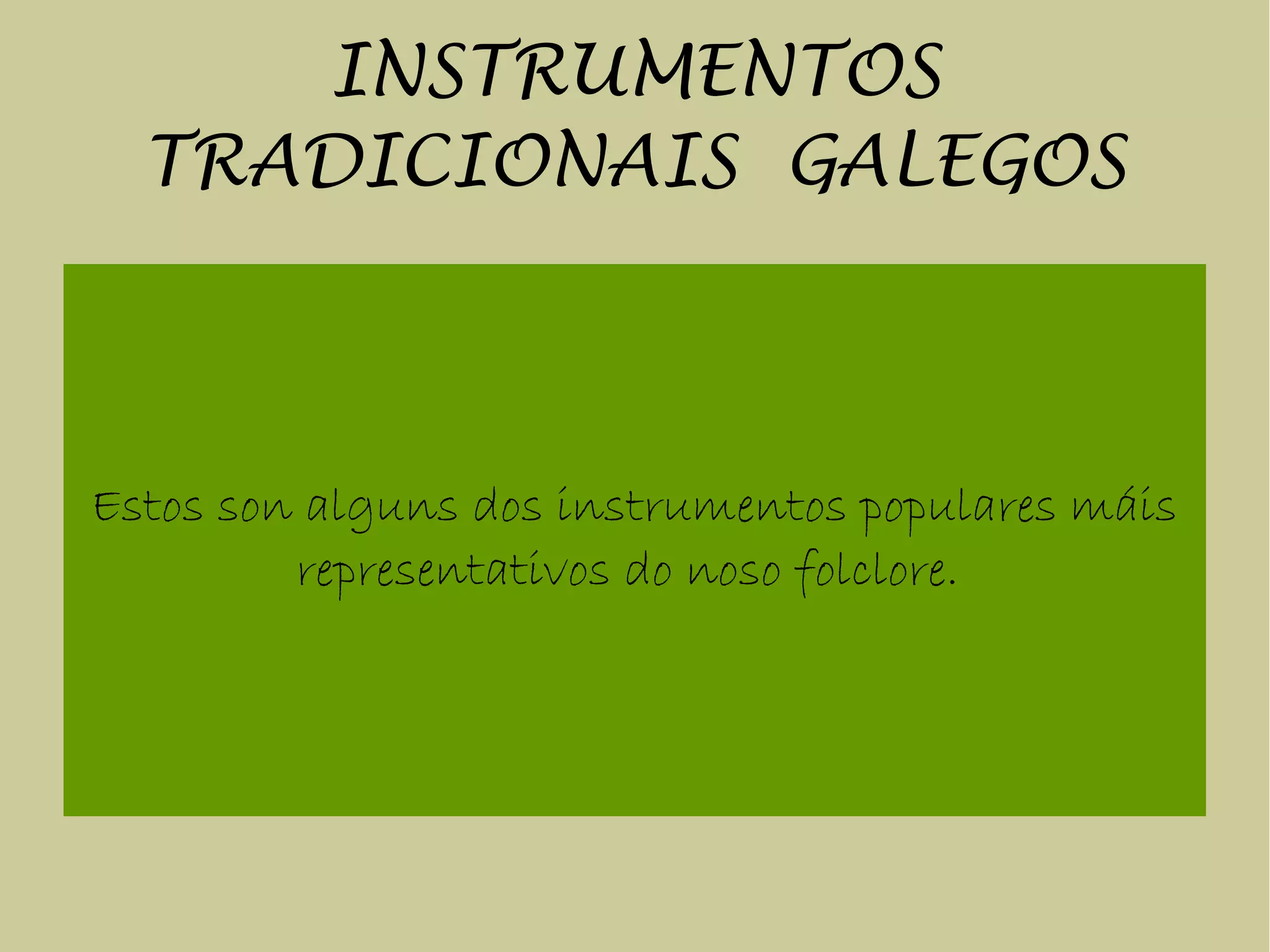 Este documento lista y describe varios instrumentos tradicionales gallegos, incluyendo gaitas, requintas, pitos pastoriles y ocarinas como instrumentos de viento; tamboriles, pandeiretas y pandeiros como instrumentos de percusión de membrana; y tarrañolas, cunchas y almireces como instrumentos de percusión de idiófonos. También menciona la zanfona como instrumento de cuerda.