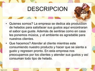 La empresa se dedica a la producción y venta de helados para satisfacer los gustos de los clientes. Su misión es brindar un excelente servicio a los clientes con innovaciones diarias y complacerlos. Su visión es expandirse a todas las zonas del país para el año 2020, brindando empleo y construyendo un país con menos desempleo. Sus objetivos incluyen fortalecer la participación de la comunidad, garantizar helados seguros y capacitar continuamente a sus empleados.