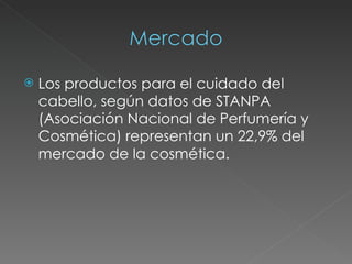 Este documento describe la historia y estrategia de marketing de la marca de productos para el cabello TRESemmé. Originalmente se vendía exclusivamente en peluquerías, pero ahora ofrece más de 40 productos a precios asequibles para el público general. Su objetivo de marketing es posicionarse como la única marca de productos profesionales de peluquería al alcance de los consumidores y fidelizar a los clientes ante la competencia como Frank Provost. Para lograrlo, utilizará tácticas de marketing directo como catálogos, televisión