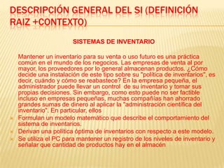 Este documento describe un software llamado Isabella 3.5 que ayuda a administrar inventarios y facturación de compras y ventas de partes de computadoras. El software mantiene registros de inventario, proveedores, clientes y productos en una base de datos para organizar y agilizar las búsquedas, almacenamiento y contabilidad. El objetivo es brindar una herramienta que facilite la gestión contable y de inventarios para almacenes.