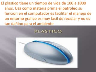 Este documento describe los principales materiales utilizados en la fabricación de computadoras, incluyendo plástico, metales como aluminio, vidrio, cobre, hierro y silicio. Explica cuánto tiempo tardan en degradarse estos materiales, sus fuentes, sus funciones en las computadoras y cómo pueden reciclarse fundiéndolos para crear nuevos productos.