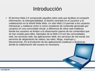 La Web 2.0 permite a los usuarios interactuar y colaborar como creadores de contenido en comunidades virtuales, a diferencia de sitios estáticos donde los usuarios solo observan. El término fue acuñado en 1999 pero popularizado en 2004 para describir la evolución hacia aplicaciones dinámicas donde la colaboración de usuarios es clave, como blogs, redes sociales y wikis.