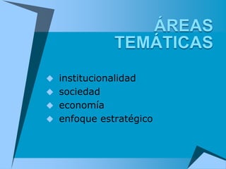 El documento describe cuatro áreas principales de interés: institucionalidad, sociedad, economía y enfoque estratégico. Cada área incluye varios temas específicos como educación, defensa nacional, política económica y competitividad del estado. El documento también menciona reuniones mensuales y canales de comunicación como un grupo de Google y un blog para intercambiar ideas sobre estos temas.