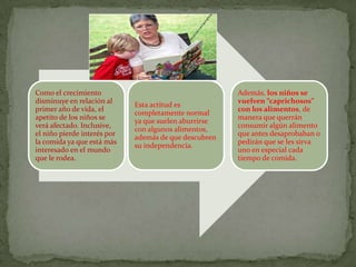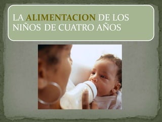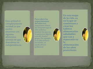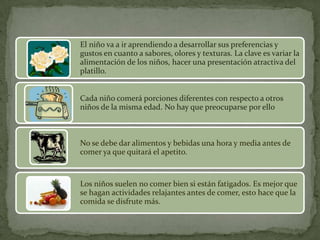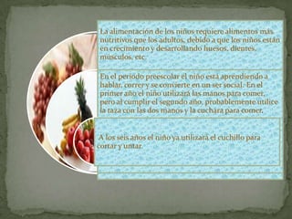 El documento habla sobre la alimentación saludable de los niños pequeños, recomendando ofrecerles la misma comida que el resto de la familia para que se acostumbren a una variedad de alimentos. También recomienda incluir frutas y verduras como refrigerios saludables entre comidas, y distribuir las calorías de una dieta preescolar entre carnes, pescados, huevos, legumbres y frutas/verduras.