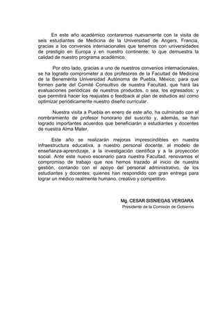 Este documento presenta la Guía Académica de la Facultad de Medicina de la Universidad Particular de Chiclayo para el semestre 2010-I, la cual incluye el reglamento estudiantil, instrumentos de evaluación, plan de estudios y sílabos de cursos. Además, proporciona información sobre los logros de la facultad incluyendo cinco promociones de médicos egresados y convenios internacionales con universidades en Europa y América. Finalmente, señala mejoras planeadas para la infraestructura educativa, personal docente, en