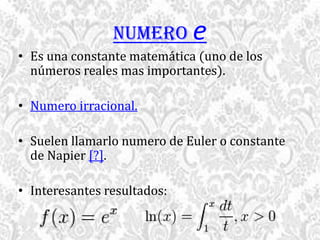 El documento describe el número e, una constante matemática irracional e importante. Explica que e no puede expresarse como una fracción de números enteros y tiene un valor aproximado infinito. También resume brevemente la historia del descubrimiento y uso de e, desde las primeras referencias en 1618 hasta su introducción por Euler en 1736.