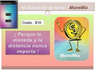 Este documento describe una aplicación llamada "MoneMix" que cuesta $10. Explica que se basó en las prácticas de la maestra y agregó su código a la actividad del proyecto para correr la aplicación en Android. Al final, muestra cómo se ve la aplicación una vez abierta. Concluye que Eclipse ha estado en desarrollo durante más de diez años y se ha consolidado como una importante área de investigación e industria, y que aunque el trabajo requiere esfuerzo, no se necesita un conocimiento avanzado de Java para lle