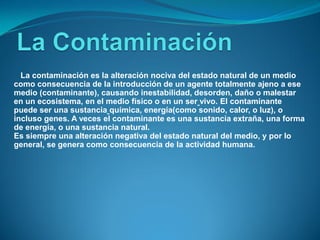 Este documento trata sobre la contaminación del agua, aire y sus efectos. Define la contaminación como la alteración nociva del estado natural de un medio debido a la introducción de un agente contaminante. Explica que la contaminación del agua puede ser causada por la industria, agricultura, ganadería y residuos domésticos, y puede afectar la salud humana. También describe la contaminación del aire como una mezcla de partículas y gases, que puede ser causada por vehículos, fábricas e industrias, y puede aumentar las