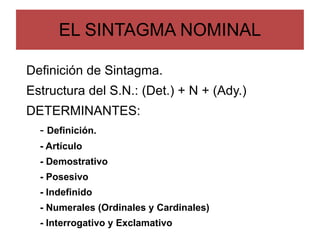 El documento define el sintagma nominal y sus componentes principales. Explica que un sintagma nominal está formado por un núcleo que puede ser un sustantivo o un pronombre, precedido opcionalmente por determinantes como artículos, demostrativos, posesivos o numerales. Además, describe las funciones y clases de sustantivos y pronombres, incluyendo sus características morfológicas y semánticas.