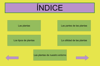 Las plantas son seres vivos que crecen de semillas y necesitan agua, aire y luz solar. Tienen raíces para absorber nutrientes, tallos con ramas y hojas verdes, y a veces flores y frutos con semillas. Los árboles tienen troncos grandes y duraderos, los arbustos tienen troncos cortos, y las hierbas son más pequeñas. Las plantas producen oxígeno y son fuente de alimento y materiales como madera, algodón, medicinas y papel.