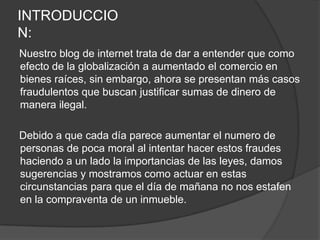 El documento trata sobre cómo el comercio de bienes raíces se ha convertido en una forma de lavar dinero debido a la globalización. Explica que cada vez hay más fraudes relacionados con la justificación ilegal de sumas de dinero a través de la compraventa de inmuebles. Propone un sitio web que brinde información legal sobre este tema, así como consejos para la detección, prevención y compra segura de bienes raíces.