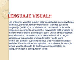 Este documento describe los elementos básicos de las imágenes visuales como el color, la forma y el movimiento. Explica que las formas básicas son el cuadrado, el triángulo y el círculo y que los elementos esenciales son el punto, la línea y el plano. También menciona que las imágenes pueden tener diferentes finalidades como transmitir información de forma objetiva, expresar emociones o crear belleza estética.