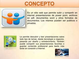 SlideShare es un sitio web para compartir presentaciones en línea. Los usuarios pueden subir presentaciones de PowerPoint, PDF y otros formatos, y pueden ser públicas o privadas. Los usuarios también pueden ver presentaciones de todo tipo de temas que otros han compartido. SlideShare fue lanzado en 2006 y adquirido por LinkedIn en 2012.