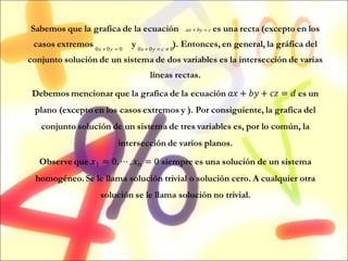 El documento explica conceptos básicos sobre sistemas de ecuaciones lineales, incluyendo sus definiciones, métodos de resolución como el método de Gauss-Jordan, y aplicaciones en diferentes campos como la fabricación, circuitos eléctricos, transmisión de calor y equilibrio de pesos.