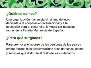 Acción Marianista es una organización sin ánimo de lucro dedicada a la cooperación internacional y la educación para el desarrollo en países como Colombia, Guatemala, Brasil, India y Cuba. Sus objetivos son impulsar programas de cooperación para el desarrollo, buscar fondos, promover la sensibilización y el voluntariado. Sus proyectos incluyen escuelas, talleres de costura, mejora de infraestructuras, becas, comedores y centros de salud y cultura.