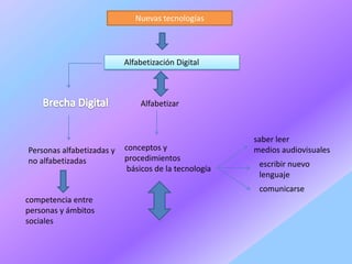 Este documento trata sobre la alfabetización digital en el contexto educativo. Introduce conceptos como CuTIC, ATIC y CMI que transforman los procesos de comunicación y mejoran las capacidades cognitivas, afectivas y sociales a través del acceso a la información. Propone el desarrollo de una conciencia crítica y constructiva en todos los niveles educativos a través de nuevas orientaciones tecnológicas que integren herramientas telemáticas y permitan al profesoror y alumno desarrollar capacidades median