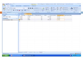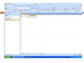 Este documento introduce MS Access 2007 y cómo crear y diseñar una base de datos. Explica que MS Access es un programa de base de datos que se utiliza para crear y administrar una base de datos. Detalla los pasos para diseñar una base de datos, incluida la identificación de entidades, el establecimiento de relaciones y la normalización. Luego proporciona un ejemplo de una base de datos de calificaciones de estudiantes de una universidad creada en MS Access.