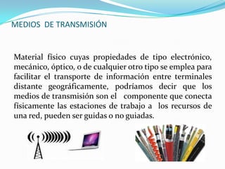 Este documento describe diferentes tipos de medios de transmisión para redes locales, incluyendo medios guiados como cables de pares trenzados, cables coaxiales y fibra óptica, así como medios no guiados como microondas e infrarrojos. Explica las ventajas e inconvenientes de cada medio, como la mayor capacidad pero también mayor complejidad del cableado de fibra óptica en comparación con cables de pares trenzados.