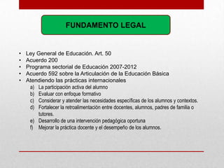 Este documento establece las normas para la evaluación, acreditación, promoción y certificación en la educación básica en Guerrero, México. Define los componentes de la evaluación, niveles de desempeño, criterios de acreditación y promoción de grado para preescolar, primaria y secundaria. También describe el contenido y uso de la cartilla de educación básica, calendario de evaluaciones, estrategias de intervención y medidas compensatorias.