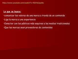 El documento habla sobre el advertainment, que combina la publicidad y el entretenimiento. Explica que las marcas buscan comunicar sus valores a través de contenidos que conecten con audiencias esquivas a la publicidad tradicional. Incluye ejemplos como product placement en películas, juegos promocionales y videos musicales patrocinados.