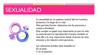 El documento describe los componentes de la sexualidad y las relaciones humanas. Explica que la sexualidad es un aspecto central del ser humano que nos permite formar relaciones y va más allá de la reproducción. Las relaciones pueden estar basadas en el amor o en el desamor. El amor es un sentimiento positivo que lleva a una convivencia sana, mientras que el desamor puede causar relaciones problemáticas y lastimar sentimientos. Aunque algunas relaciones se basen en el desamor, eso no significa que el amor sea malo.
