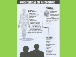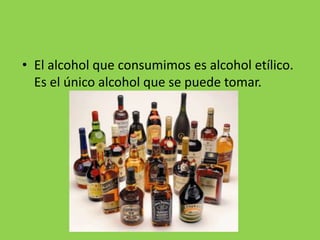 El documento describe los efectos del alcohol en el cuerpo humano. Explica que el alcohol etílico es el único alcohol que se puede consumir y que se produce mediante la fermentación o destilación. Luego detalla cómo actúa el alcohol en el sistema nervioso central, hígado e intestinos, causando depresión del funcionamiento del cerebro. Finalmente, advierte sobre los riesgos del consumo excesivo de alcohol como accidentes, enfermedades y problemas durante el embarazo.