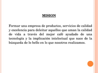 Este documento presenta la misión, visión, objetivos, valores y un análisis FODA de la cafetería The Home Coffe. La misión es formar una empresa de calidad para deleitar a los amantes del café a través de la tecnología e intelecto. La visión es ser un punto de referencia de la cultura del café en el país a través de la innovación. Los objetivos incluyen ser los mejores en el mercado y ofrecer el mejor café y servicios de calidad. Los valores principales son la buena imagen, el uso de uniformes y