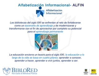 El documento describe el desarrollo de un programa de alfabetización informacional (ALFIN) en la Red de Bibliotecas Públicas de Bogotá (BibloRed). Se explica que el programa tiene como objetivos desarrollar competencias informacionales en los usuarios y promover el aprendizaje a lo largo de la vida. El documento resume los antecedentes, estructura, metodología, logros y retos del programa ALFIN en BibloRed, el cual busca fortalecer las habilidades de los usuarios para encontrar, evaluar y usar información de manera