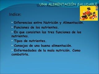 El documento resume las diferencias entre nutrición y alimentación, las tres funciones principales de los nutrientes (energética, plástica reparadora y reguladora), los siete grupos de alimentos, consejos para una buena alimentación como seguir la pirámide alimenticia, y las enfermedades relacionadas con la mala nutrición como la obesidad y cómo combatirlas con dieta y ejercicio.