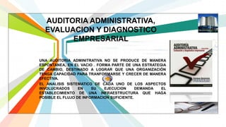 El documento presenta un resumen histórico de los antecedentes de la auditoría administrativa desde las primeras civilizaciones hasta la actualidad. Se describen los primeros desarrollos de prácticas de control administrativo en las civilizaciones sumeria, egipcia y babilónica, así como en China entre los años 4000 AC y 1766 AC. También se mencionan las primeras contribuciones en Europa y América entre los años 1800 y 1960, que llevaron al desarrollo de la auditoría administrativa como disciplina. Finalmente, se enumeran varios autores e instituc