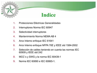 El documento trata sobre los efectos negativos del arco eléctrico. Discute los enfoques de las normas IEC 61641, NFPA 70E e IEEE std 1584-2002 sobre el arco interno. También cubre la selección de cables de acuerdo a las normas IEC 60909 e IEEE std 242 y los MCC y SWG según la norma IEC 60439-1.