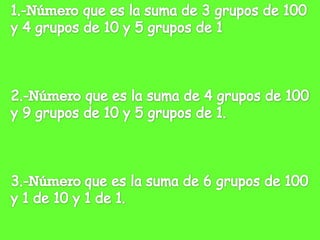 El documento presenta una lección sobre números y su representación. Explica las unidades, decenas y centenas, y cómo representar números usando fichas. Muestra ejemplos numéricos y ejercicios para practicar la ubicación de unidades, decenas y centenas. También incluye enlaces a páginas web con más recursos sobre este tema.