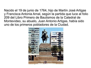 José Artigas (1764-1850) fue una figura prócer de la historia de Uruguay. Nació en Montevideo y se unió al ejército español en 1797 donde ascendió a capitán. Lideró las fuerzas que resistieron a las invasiones inglesas en 1807 y organizó fuerzas de resistencia en el interior del país. Fue respetado por la gente del campo y desempeñó un papel clave en la Revolución del Río de la Plata.